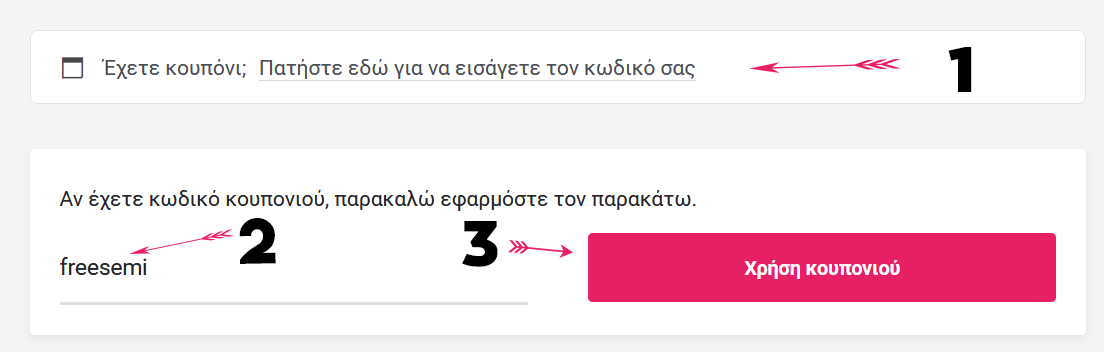 - Τέλος, στην σελίδα πληρωμής (ταμείο), πατάμε για εισαγωγή κουπονιού, όπως αναφέρεται στην παρακάτω εικόνα: